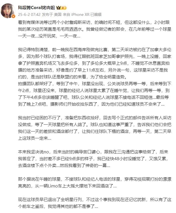 6月2日訊 前記者、萊昂納德中方經(jīng)紀(jì)人“烤肉姐”陸垠箐發(fā)文談到了此前采訪的NBA球星。