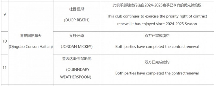 其中,青島男籃仍然享有杜普-里斯的優(yōu)先續(xù)約權(quán),此外球隊已經(jīng)和米奇和韋瑟斯龐完成續(xù)約。