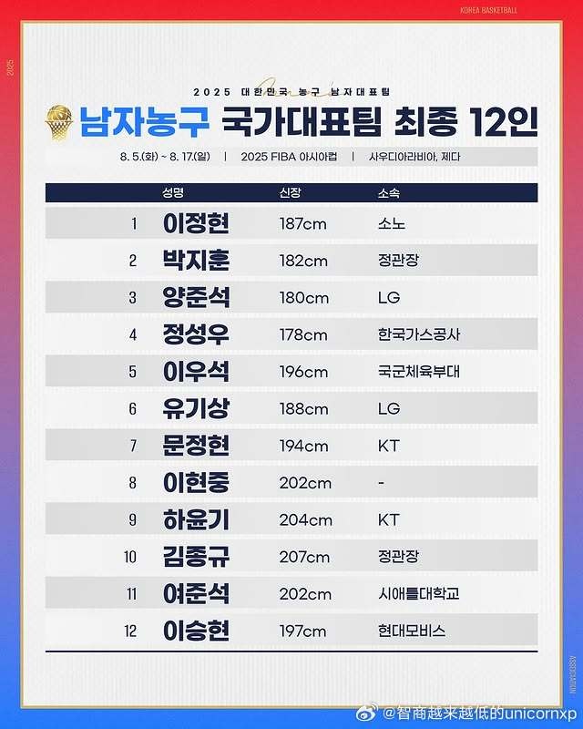7月21日訊 今天,韓國籃協(xié)宣布了亞洲杯的12人名單。