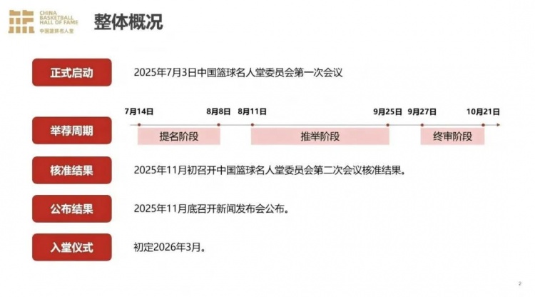 2025年中國籃球名人堂的入堂規(guī)模計(jì)劃為9名個(gè)人和1個(gè)集體,具體包括:杰出運(yùn)動(dòng)員4人(男女各2人)、杰出教練員1人、杰出裁判員1人、中國籃球先行者3人,以及優(yōu)秀集體1個(gè)。