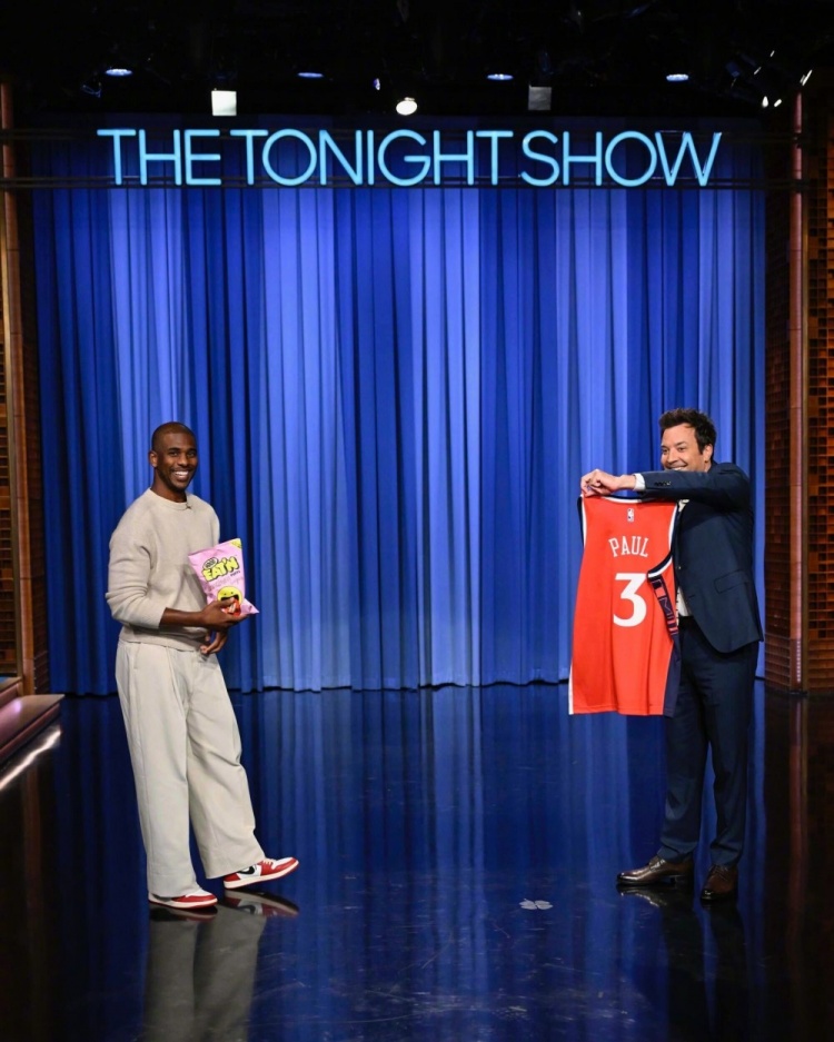 日前,保羅帶著3號快船球衣亮相《吉米今夜秀》(The Tonight Show),并與主持人一同合影。