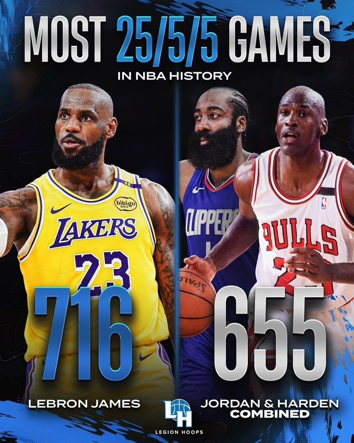??美媒曬25+5+5場(chǎng)次:詹姆斯716場(chǎng) 哈登和喬丹一共655場(chǎng)