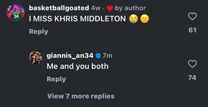 該球迷發(fā)文稱自己很想米德爾頓,隨后字母哥回復(fù):“我和你一樣想他?!?/p>