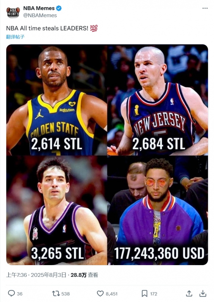 ??美媒玩梗:本西高居搶斷榜歷史第一 力壓斯托克頓基德保羅