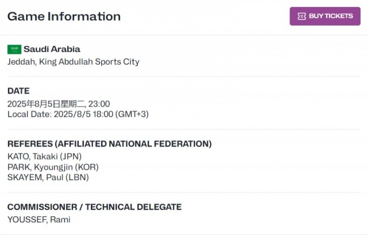 本場比賽的裁判組已經(jīng)出爐,吹罰本場比賽的三名裁判分別是加藤譽樹(日本)、樸景鎮(zhèn)(韓國)、保羅-斯卡耶姆(黎巴嫩)。