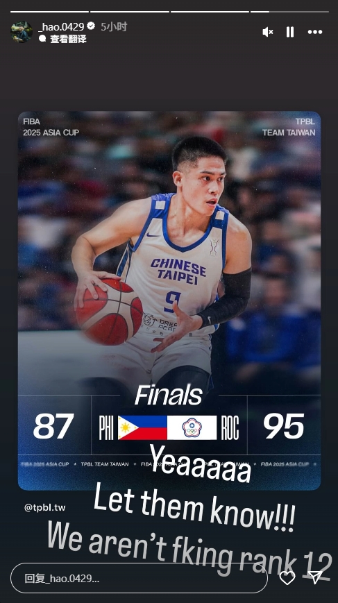 賽后,中國(guó)臺(tái)北男籃前鋒、綽號(hào)“寶島杜蘭特”的馬建豪更新社媒動(dòng)態(tài),曬出比賽海報(bào)(圖上人物是狂砍34分的陳盈駿),并寫(xiě)道:“是啊,讓他們知道?。?!我們TM不是第12名的水平?!?/p>