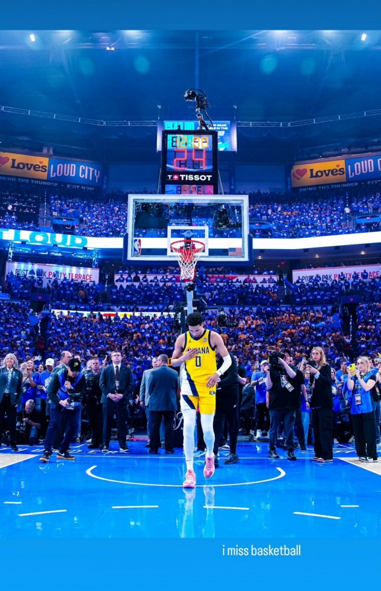 哈利伯頓轉(zhuǎn)發(fā)了一張個人賽場照,并配文道:“我想念籃球?!?/p>
