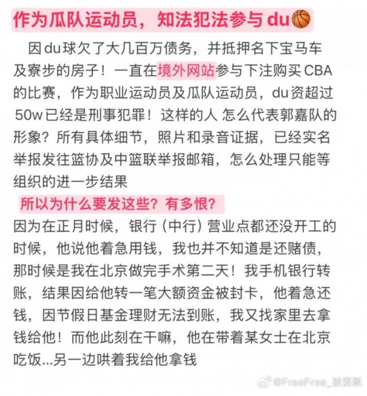 女網(wǎng)友表示徐杰欠下大幾百萬(wàn)賭債,還抵押了名下寶馬車以及寮步的房子。徐杰一直在境外網(wǎng)站參與下注CBA比賽,她表示自己已向籃協(xié)和中籃聯(lián)郵箱實(shí)名舉報(bào)。