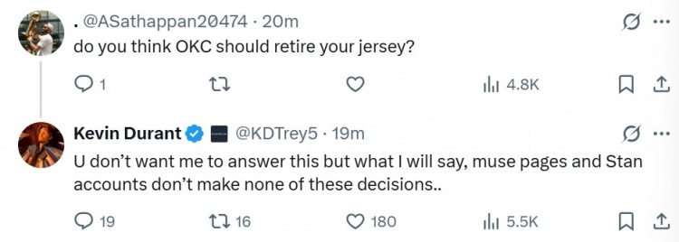 杜蘭特:你并不希望我回答這個(gè)問題,但我要說的是,粉絲和鐵桿粉絲賬號并不參與這些決策。