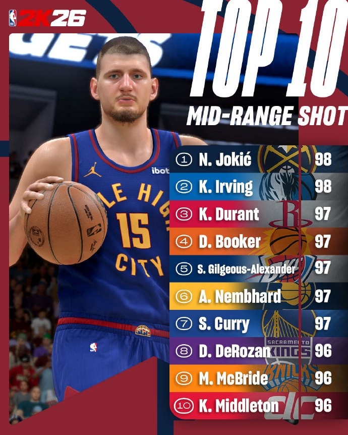 在這次的評(píng)分當(dāng)中,尼科拉-約基奇和凱里-歐文的中距離均為98分,而凱文-杜蘭特的中距離為97分。此外,尼克斯球員邁爾斯-麥克布萊德的中距離為96分。