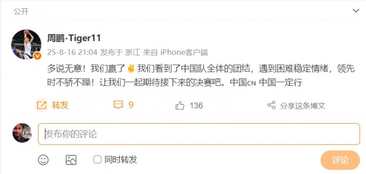 比賽結(jié)束后,老將周鵬在社媒上向中國(guó)男籃送上了祝賀,寫(xiě)道:“多說(shuō)無(wú)意!我們贏了??我們看到了中國(guó)隊(duì)全體的團(tuán)結(jié),遇到困難穩(wěn)定情緒,領(lǐng)先時(shí)不驕不躁!讓我們一起期待接下來(lái)的決賽吧。中國(guó)???? 中國(guó)一定行 ???”