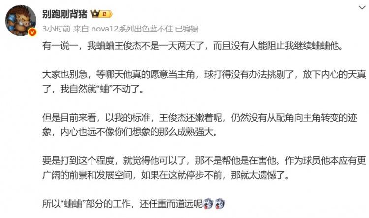 賽后,媒體人@別跑剛背豬發(fā)文談到了王俊杰,內(nèi)容如下: