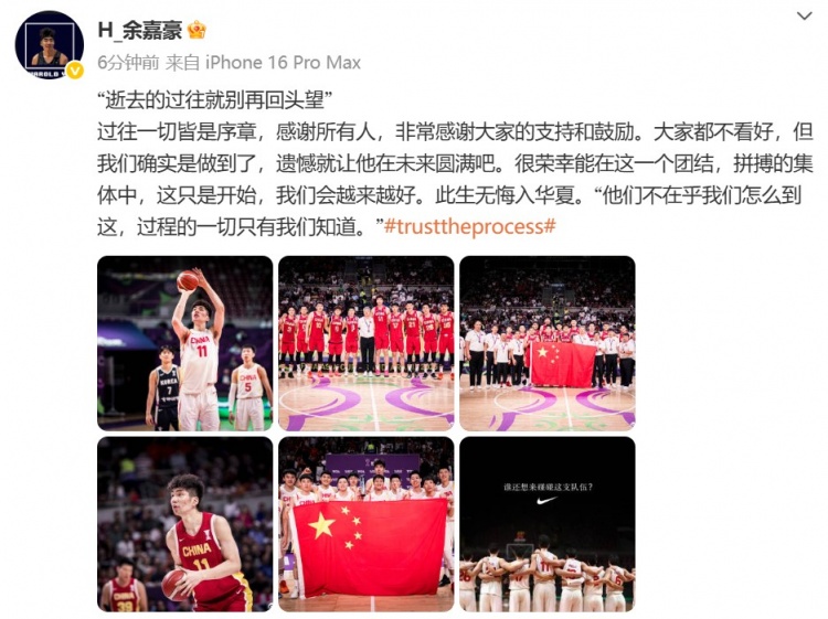 中國(guó)男籃球員余嘉豪發(fā)文總結(jié)了本次亞洲杯,其寫(xiě)道: