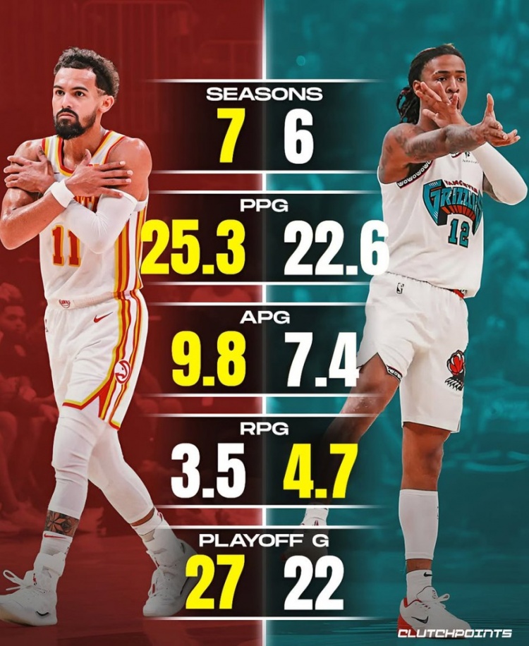 8月19日訊 今天,美媒ClutchPoints對(duì)比莫蘭特和特雷-楊生涯數(shù)據(jù)。
