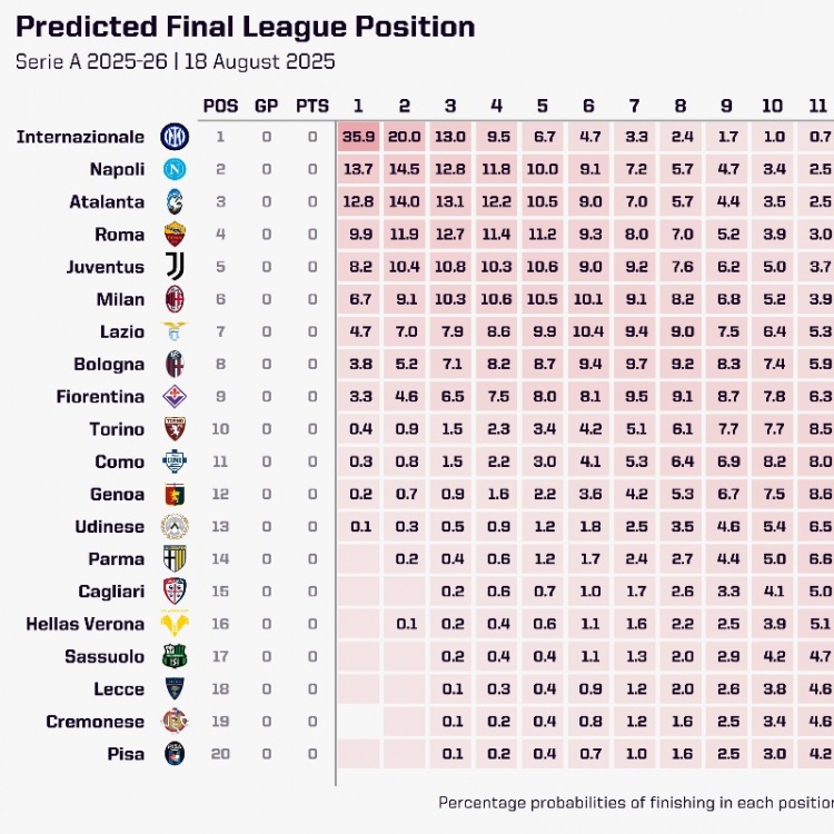 8月21日訊 opta通過超級計算機預測本賽季意甲排名,國米有35.9%的概率奪冠,在奪冠概率上那不勒斯、亞特蘭大分列二三位。
