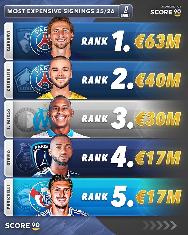 1、扎巴爾尼,伯恩茅斯→巴黎,6300萬(wàn)歐