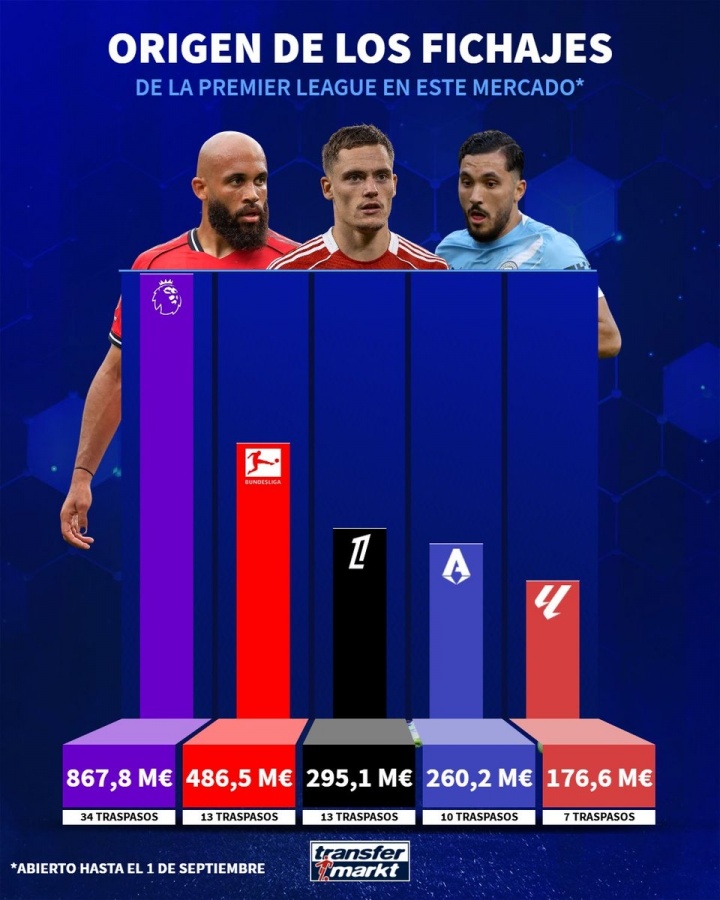 08月21日訊 德轉(zhuǎn)統(tǒng)計了夏窗截至目前英超球隊的引援來源,其中來自英超內(nèi)部的人數(shù)最多,有34人,德甲位居第二,共有13人,花費4.865億歐。