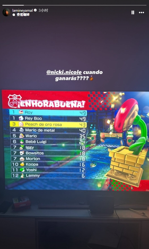 08月22日訊 今日亞馬爾更新個(gè)人ins快拍曬出玩馬里奧賽車游戲的圖,同時(shí)艾特緋聞女友尼基-妮可,并寫道:你什么時(shí)候能贏????
