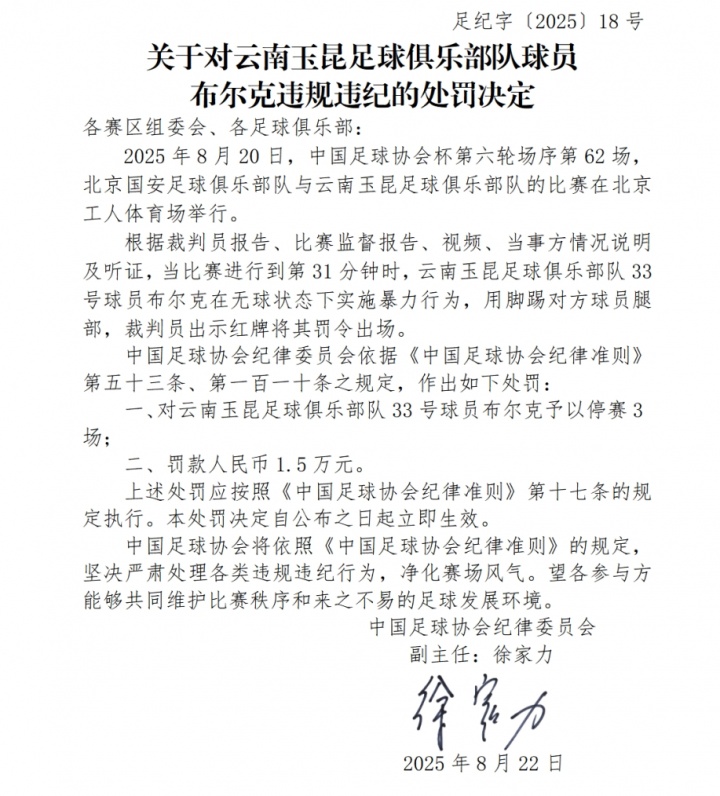 08月22日訊 今日足協(xié)官方公布布爾克紅牌處罰結(jié)果,云南玉昆球員布爾克在足協(xié)杯中對(duì)法比奧實(shí)施暴力行為,對(duì)其停賽3場(chǎng),罰款1.5萬元。