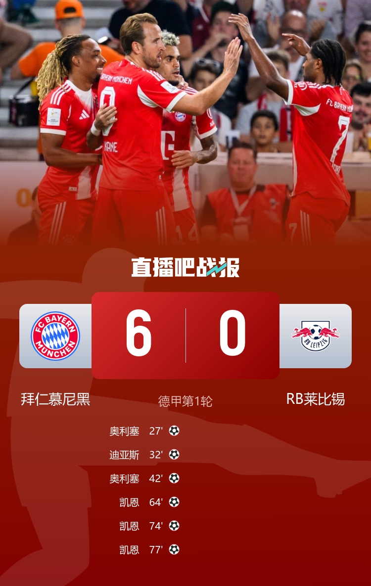 8月23日訊 北京時(shí)間8月23日凌晨2:30,2025-26賽季德甲聯(lián)賽第1輪,拜仁坐鎮(zhèn)安聯(lián)球場迎戰(zhàn)萊比錫。上半場奧利塞雙響,路易斯-迪亞斯打入個(gè)人德甲首球,格納布里兩助攻,拜仁暫3-0萊比錫;下半場凱恩戴帽,努薩進(jìn)球被取消,最終拜仁6-0大勝萊比錫,收獲開門紅。