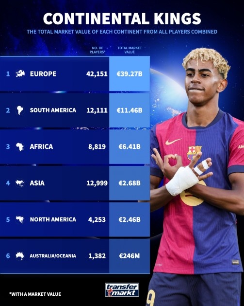 各大洲身價最高球員: