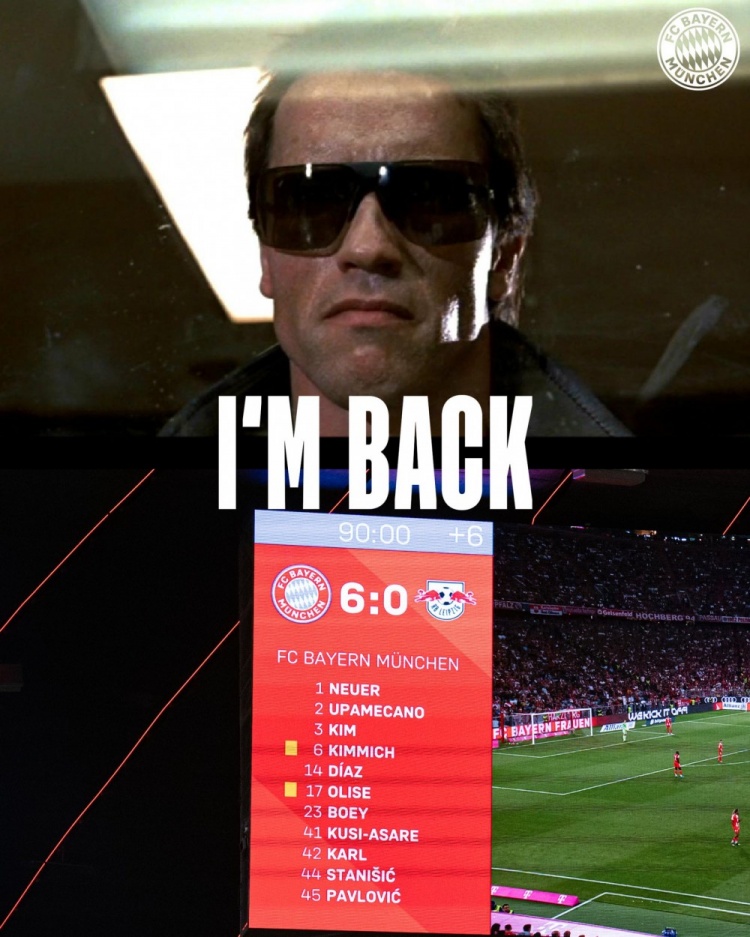 拜仁官方社媒曬出帶有6-0比分牌的終結(jié)者主題海報(bào),配文:“I'M BACK?!?/p>