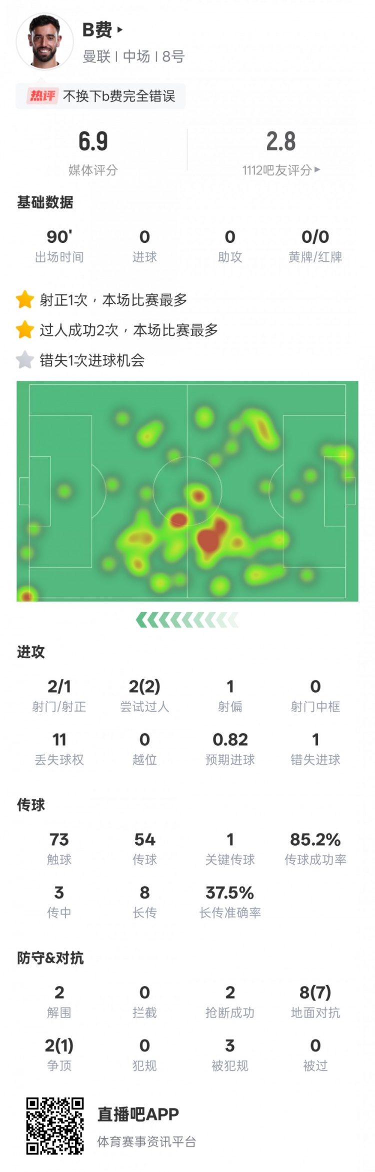 8月25日訊 2025-26賽季英超第2輪,曼聯(lián)客場(chǎng)1-1富勒姆。B費(fèi)首發(fā)出戰(zhàn),罰丟點(diǎn)球,另外他有2次過(guò)人成功和1次關(guān)鍵傳球,評(píng)分6.9。