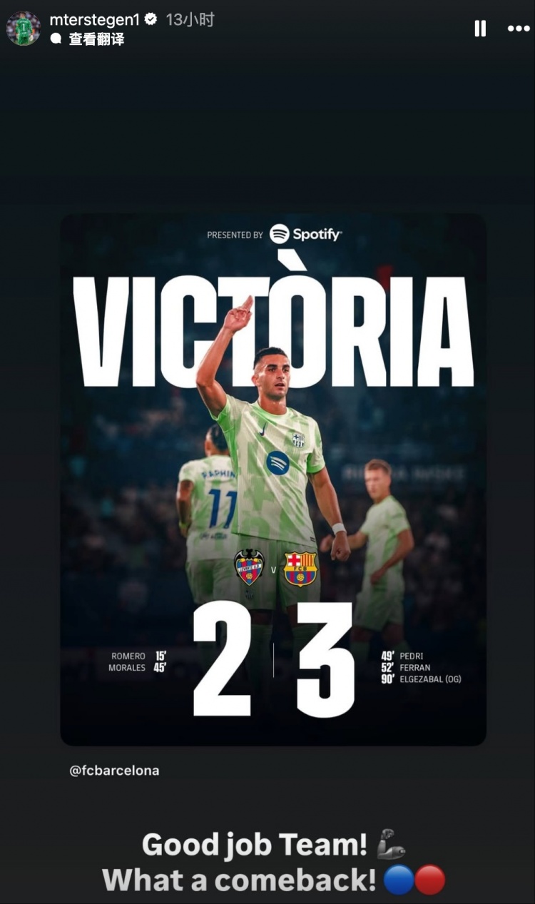 特爾施特根社媒寫道:干得漂亮!隊(duì)友們??真是一場精彩的大逆轉(zhuǎn)????