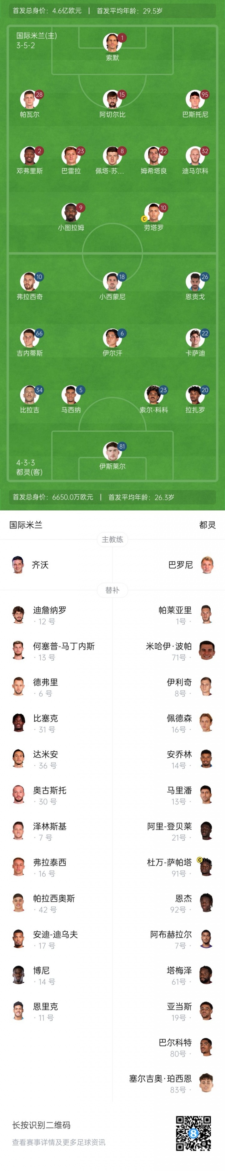 國米替補:12-迪詹納羅、13-何塞普-馬丁內(nèi)斯、6-德弗里、7-澤林斯基、11-路易斯-恩里克、14-博尼、16-弗拉泰西、17-迪烏夫、30-奧古斯托、31-比塞克、36-達米安、42-帕拉西奧斯