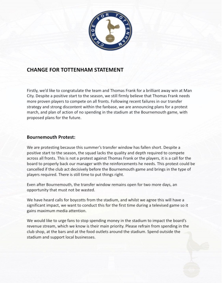 8月27日訊 熱刺今夏的球員引入工作陷入了困境,他們?cè)谵D(zhuǎn)會(huì)市場(chǎng)屢屢受挫,由于不滿球隊(duì)糟糕的轉(zhuǎn)會(huì)操作,一個(gè)名為“change for tottenham”的熱刺球迷組織發(fā)布了聲明,號(hào)召在周末主場(chǎng)對(duì)陣伯恩茅斯的比賽中對(duì)球隊(duì)高層進(jìn)行抗議活動(dòng)。