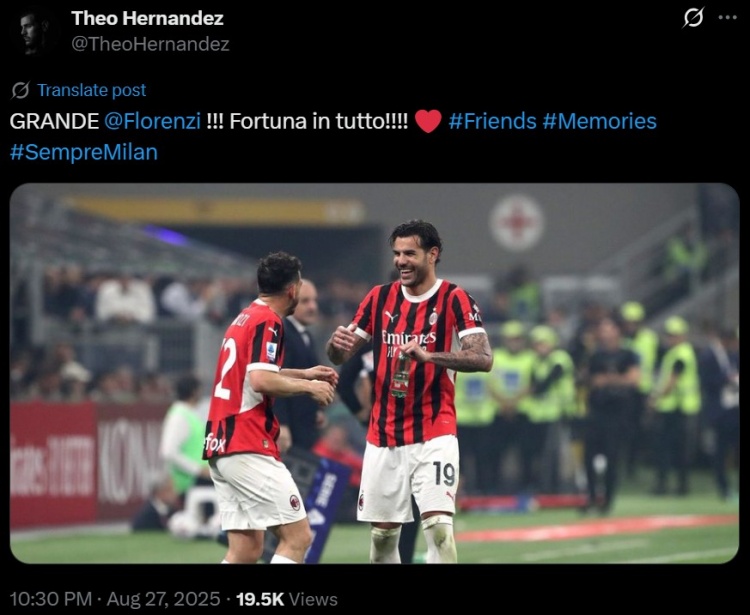 弗洛倫齊的前隊(duì)友特奧更新社媒,曬出兩人共同效力米蘭時(shí)的賽場(chǎng)合照,為他送上祝福。
