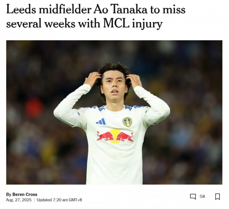 8月28日訊 TA報(bào)道,利茲聯(lián)中場(chǎng)田中碧因內(nèi)側(cè)副韌帶受傷,將傷缺數(shù)周時(shí)間。