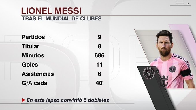 ESPN統(tǒng)計(jì)表明,自世俱杯之后,梅西參加9場比賽,其中8次首發(fā),出場時(shí)間686分鐘,打進(jìn)11球,送出6個(gè)助攻,平均每40分鐘造1球。