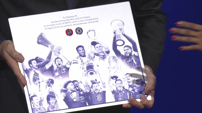 歐足聯(lián)主席切費(fèi)林登臺(tái)為切爾西俱樂部頒發(fā)特別獎(jiǎng)項(xiàng),切爾西是唯一包攬現(xiàn)今歐洲男子俱樂部全部頂級(jí)賽事冠軍(歐冠、歐聯(lián)、歐協(xié)聯(lián)、歐洲超級(jí)杯)及現(xiàn)已停辦的歐洲優(yōu)勝者杯的球隊(duì)。