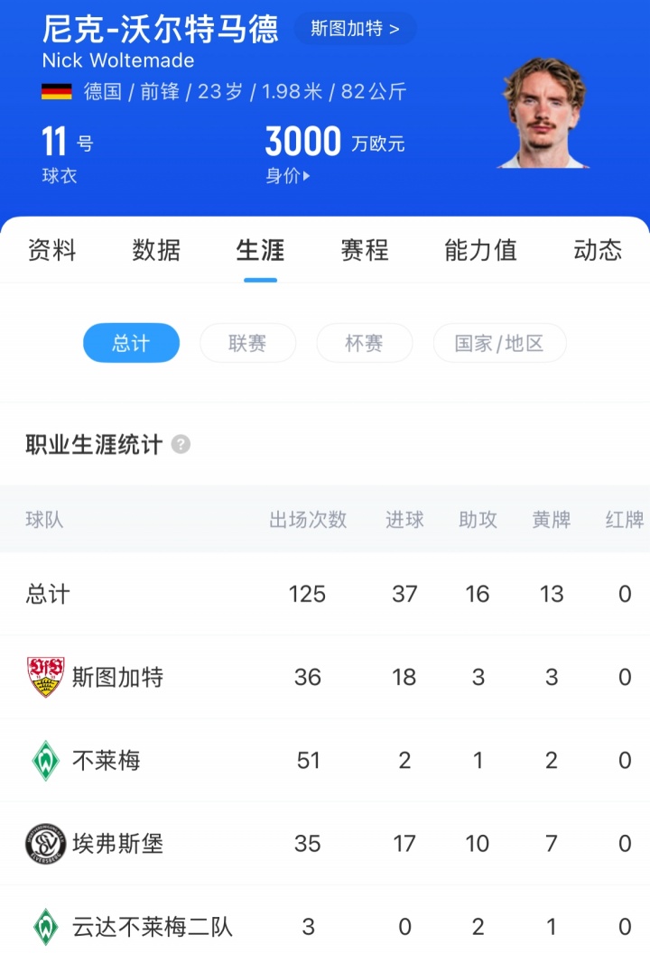 沃爾特馬德上賽季共為斯圖加特出戰(zhàn)33場,打進(jìn)17球助攻3次,目前德轉(zhuǎn)身價3000萬歐。
