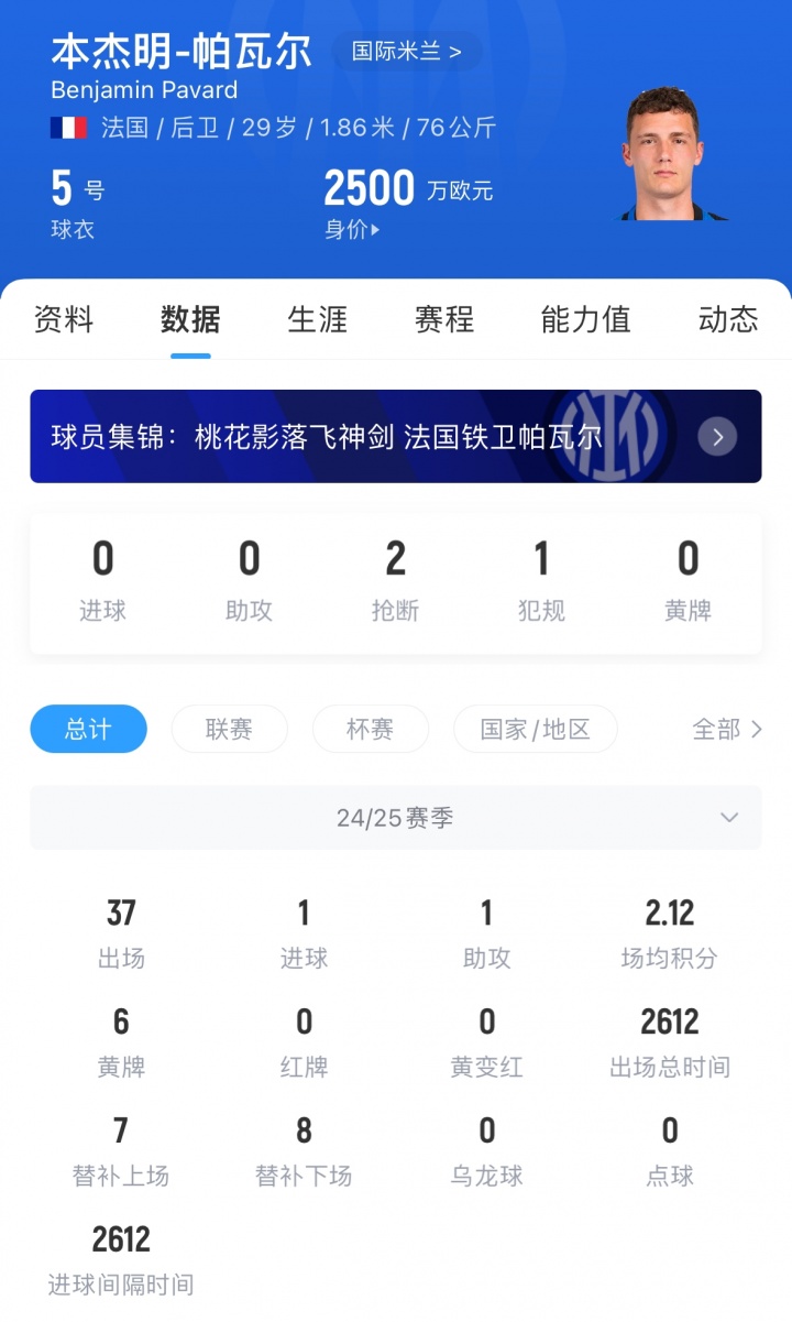 帕瓦爾現(xiàn)年29歲,2023年夏窗3140萬歐元從拜仁加盟國米,截至目前共為國米出場70次,他的德轉身價為2500萬歐元。