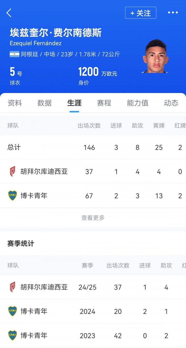 埃茲奎爾-費(fèi)爾南德斯現(xiàn)年23歲,阿根廷籍,司職防守型中場,上賽季各項(xiàng)賽事37場1球4助攻,德轉(zhuǎn)身價(jià)1200萬歐。