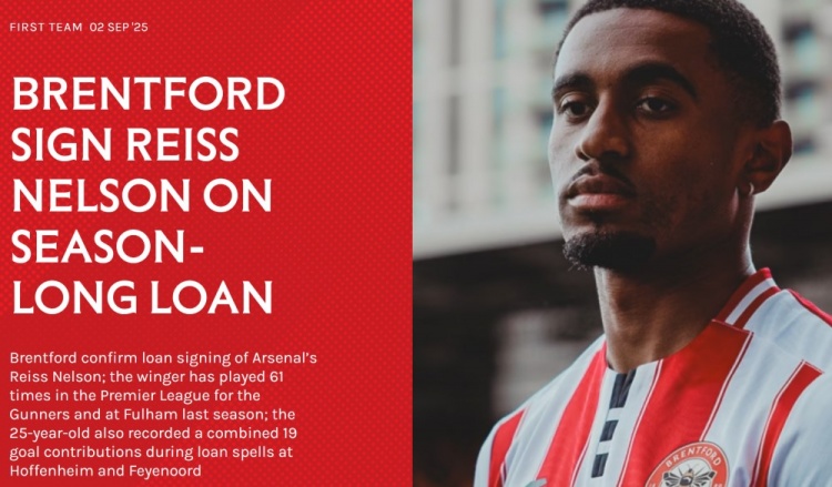 官方:布倫特福德租借阿森納25歲右邊鋒雷斯-尼爾森1個賽季