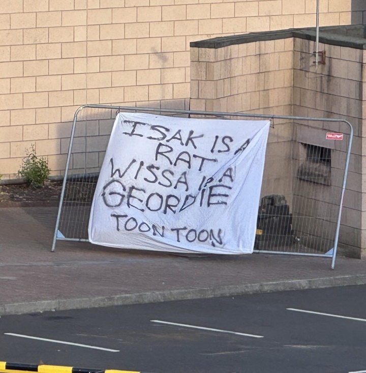 標語上寫著,Isak is a rat, Wissa is a Geordie, Toon Toon.(翻譯參考:伊薩克是叛徒,維薩是自家人,紐卡!紐卡!)