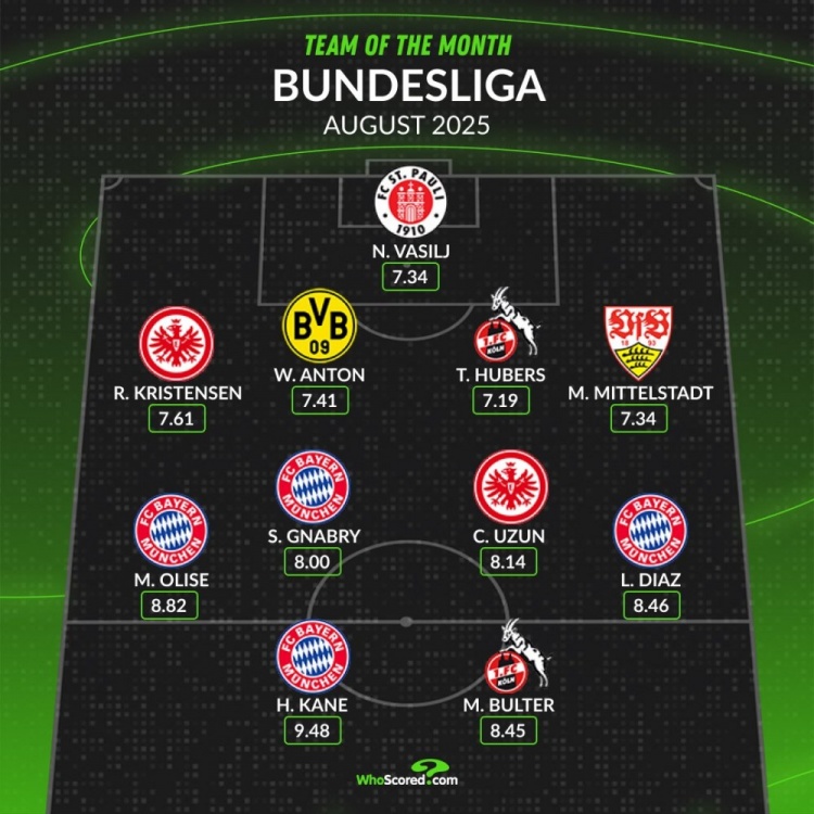 中場:奧利塞(拜仁,8.82分)、格納布里(拜仁,8.00分)、詹-烏尊(法蘭克福,8.14分)、路易斯-迪亞斯(拜仁,8.46分)