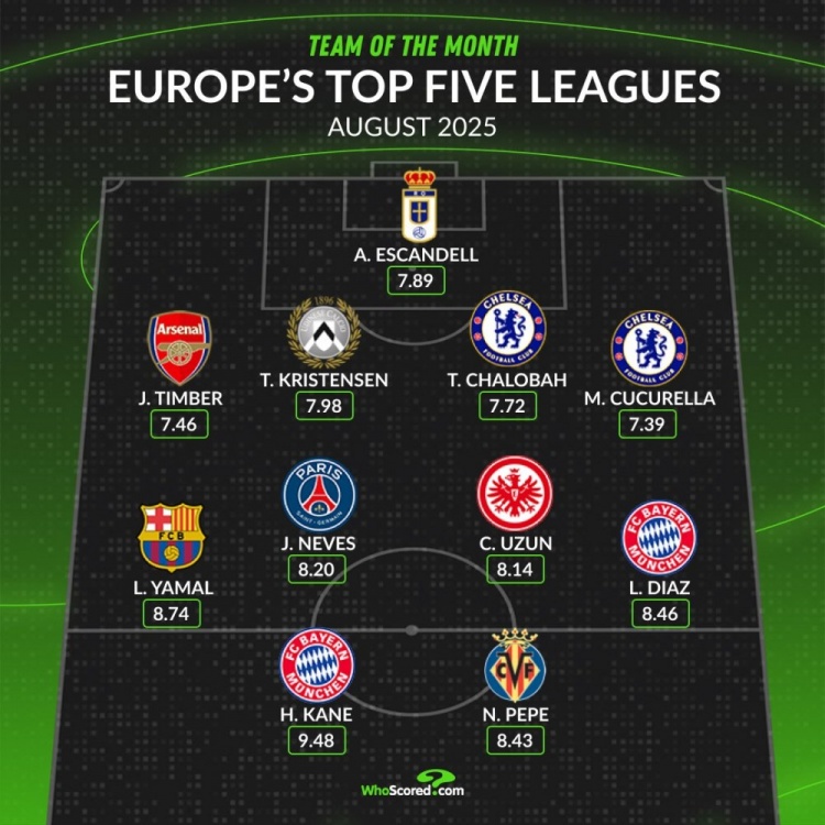 9月2日訊 五大聯(lián)賽迎來短暫休賽,whoscored也統(tǒng)計了五大聯(lián)賽8月評分最佳陣容,凱恩以9.48分領(lǐng)銜。