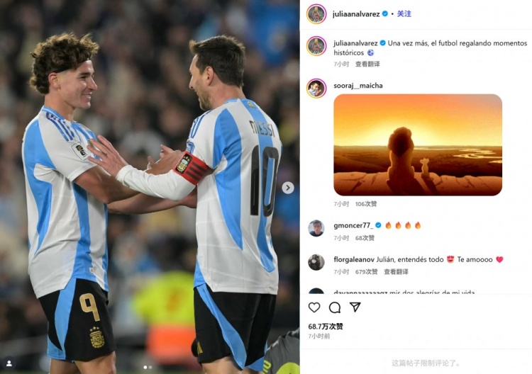 阿爾瓦雷斯在賽后也曬出他和梅西的慶祝照,并配文:“又一次,足球奉上了歷史性時(shí)刻。”