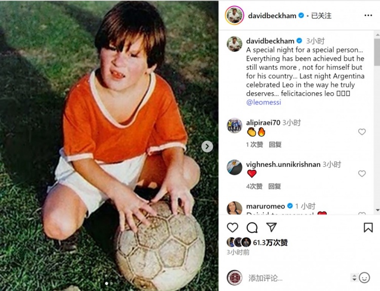 英格蘭足壇名宿、邁阿密國際老板貝克漢姆更新社媒動態(tài),曬出梅西兒時的照片,并寫道:“一個特別的人度過了一個特別的夜晚……他已經(jīng)取得了一切成就,但他仍然渴望更多,不是為了自己,而是為了他的國家……昨晚阿根廷以他真正應得的方式致敬了萊奧……祝賀萊奧。”