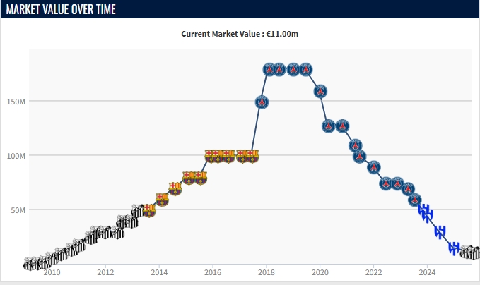 內(nèi)馬爾的身價曾在2018-2019年達到巔峰的1.8億歐。但在過去兩年間,內(nèi)馬爾的身價暴跌了4900萬歐。