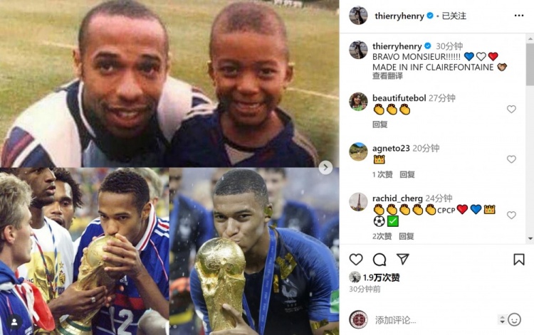 亨利社媒曬出自己與姆巴佩昔日的合照,并配文:“干得好,小伙子!克萊楓丹制造!”