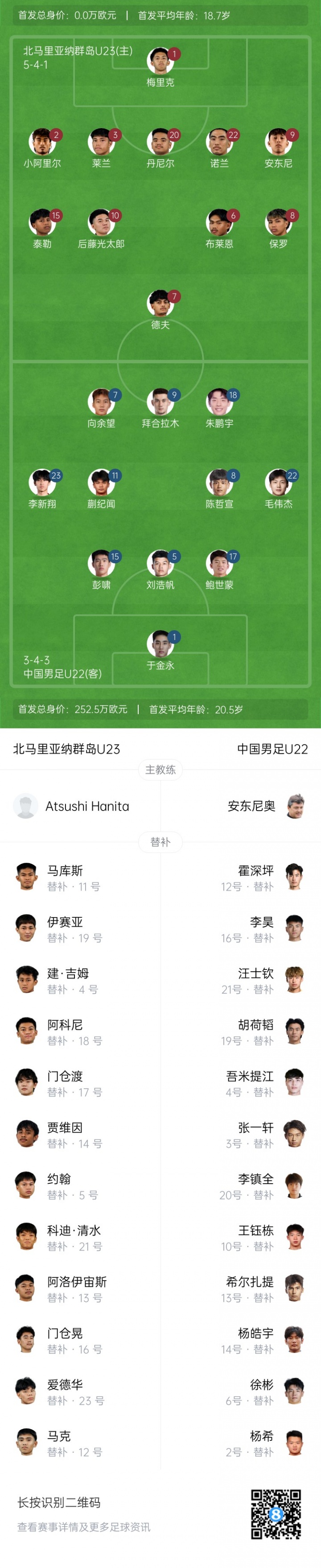 中國U22首發(fā):1-于金永、5-劉浩帆、15-彭嘯、17-鮑世蒙、8-陳哲宣、11-蒯紀(jì)聞、22-毛偉杰、23-李新翔、7-向余望、9-拜合拉木、18-朱鵬宇