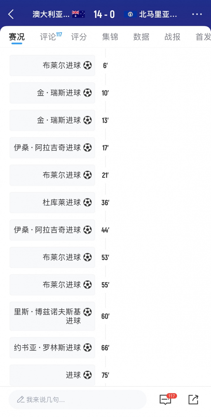 預(yù)選賽第1輪,澳大利亞14-0狂勝北馬里亞納群島,上半場,澳大利亞就狂轟7球。