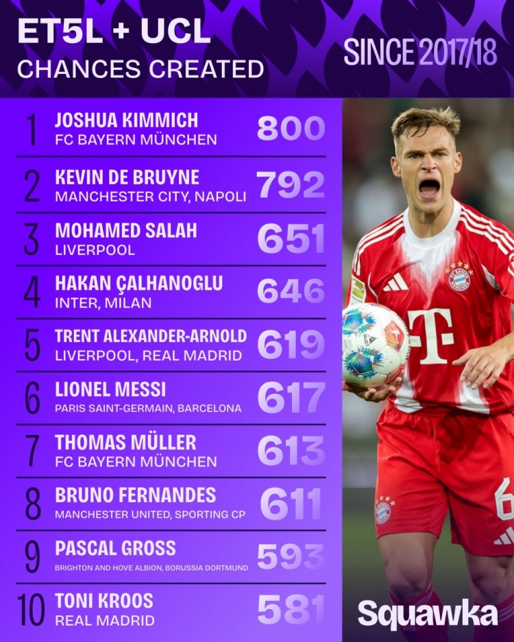 9月7日訊 數據機構squakwa統(tǒng)計了17-18賽季以來五大聯(lián)賽+歐冠的創(chuàng)造機會情況,基米希力壓德布勞內居首。
