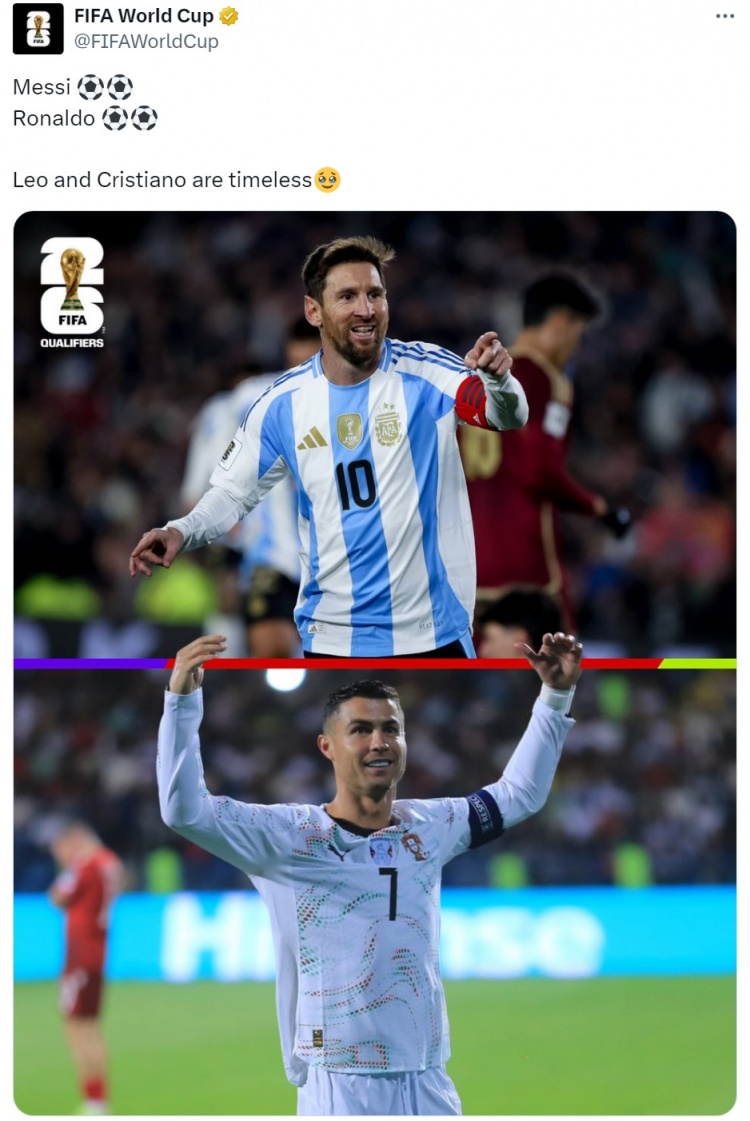 9月7日訊 世界杯官方更新社媒動態(tài),曬出梅西和C羅的照片。