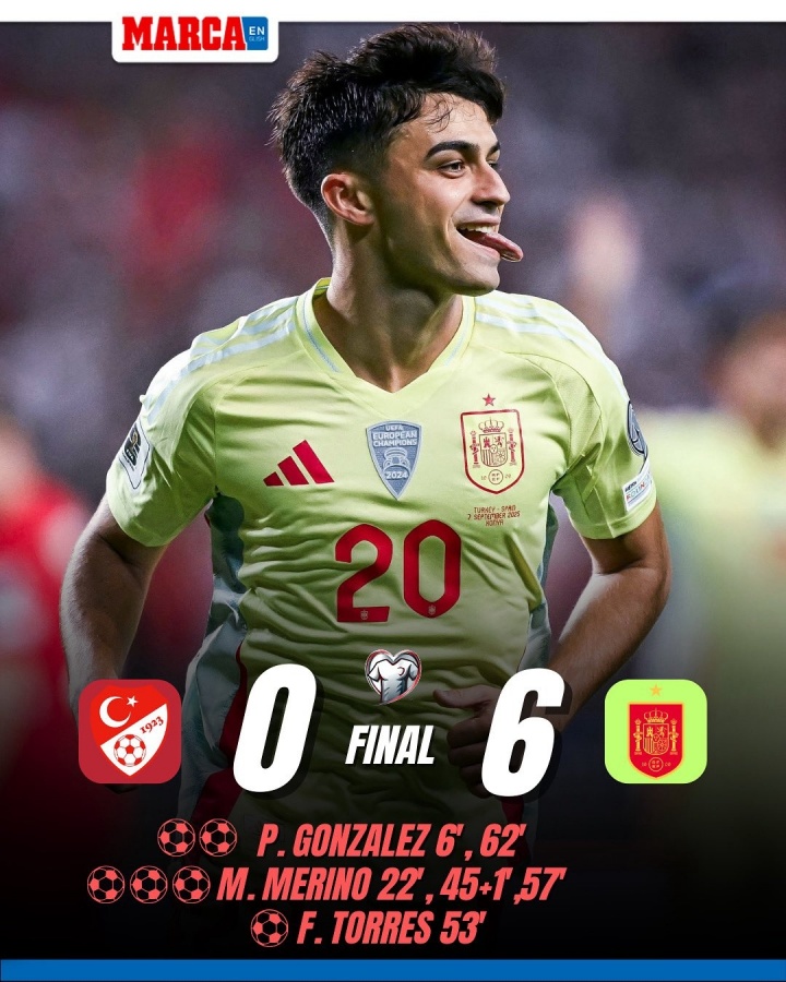 西班牙6-0大勝土耳其,巴薩22歲中場核心佩德里打入兩粒進球。